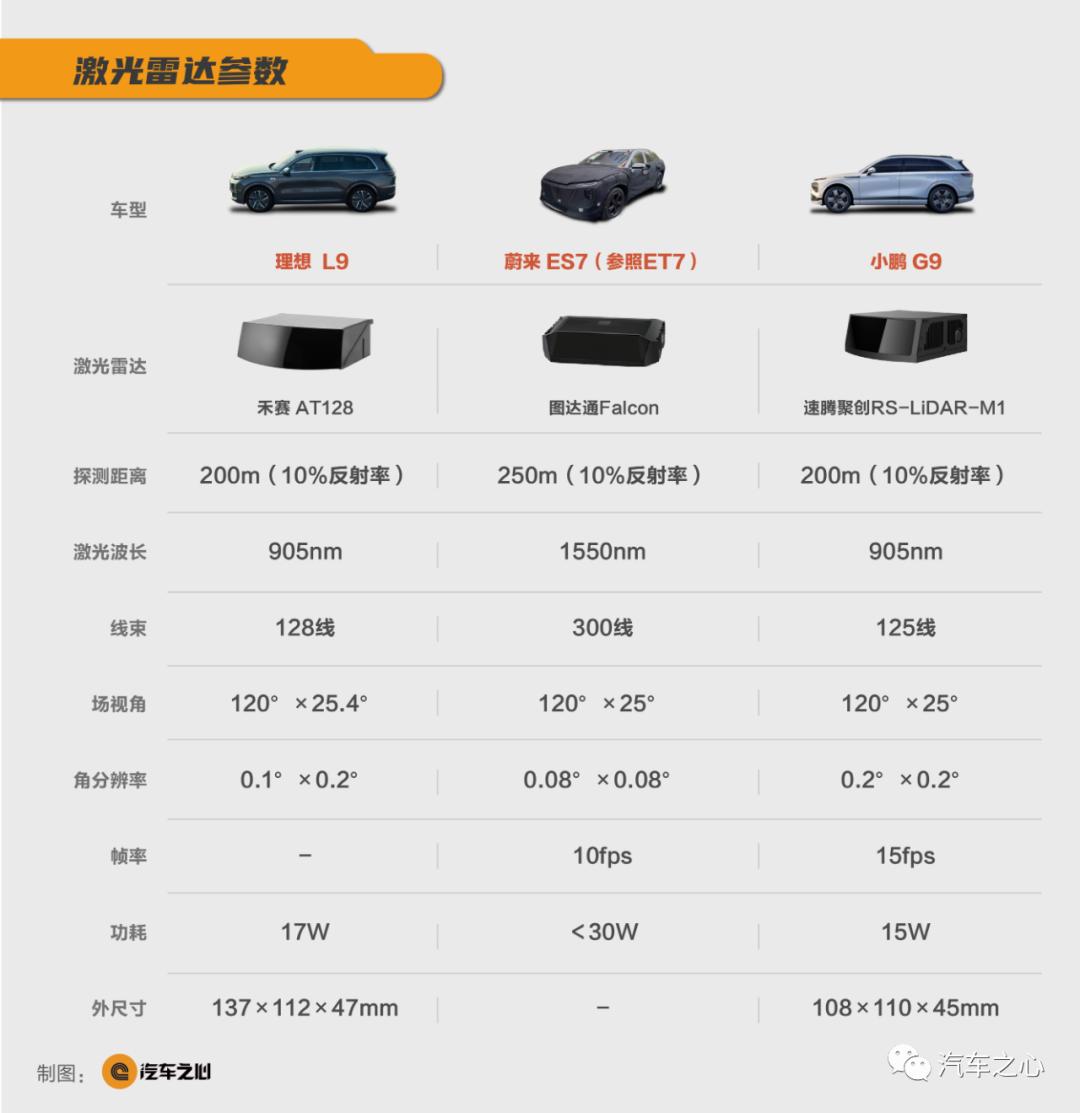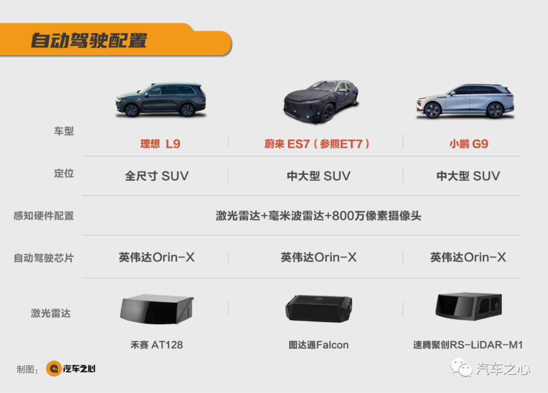 理想 L9、蔚来 ES7、小鹏 G9 作为蔚小理进入新阶段的车型,无一例外搭载了激光雷达、高算力芯片、800 万像素摄像头等等。