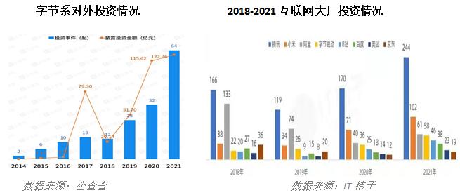 投资过程中,我们可以看到字节偏向于并购、战略投资,占到总投资数量的56%。短短5年时间,字节跳动收购的公司数已经达42家,远超百度的10个和腾讯的20个、阿里的21个,成为继阿里、腾讯之后的“新晋并购王”。