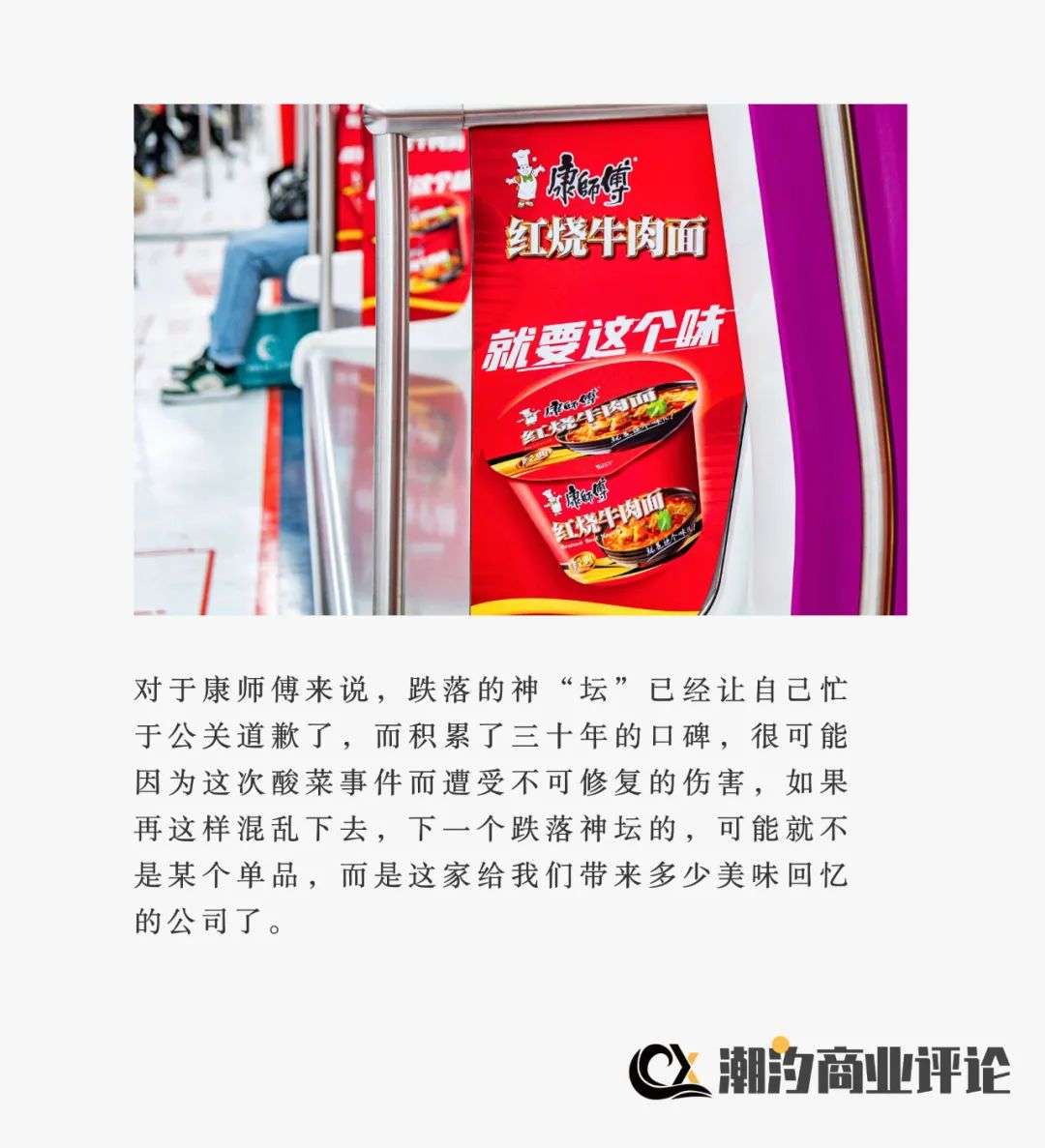 对于康师傅来说,跌落的神“坛”已经让自己忙于公关道歉了,而积累了三十年的口碑,很可能因为这次酸菜事件而遭受不可修复的伤害,如果再这样混乱下去,下一个跌落神坛的,可能就不是某个单品,而是这家给我们带来多少美味回忆的公司了。