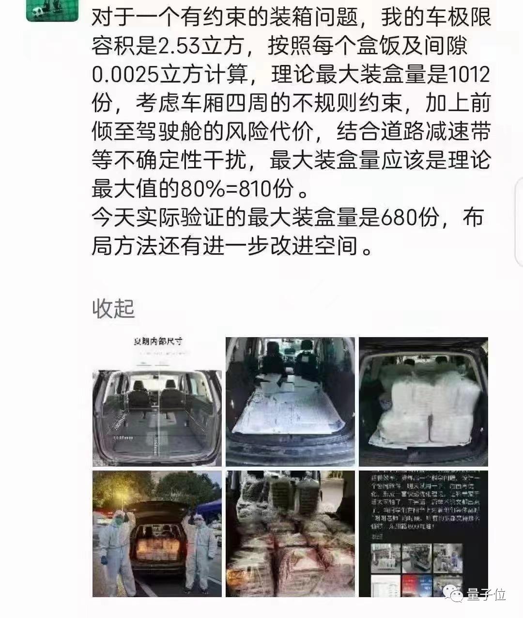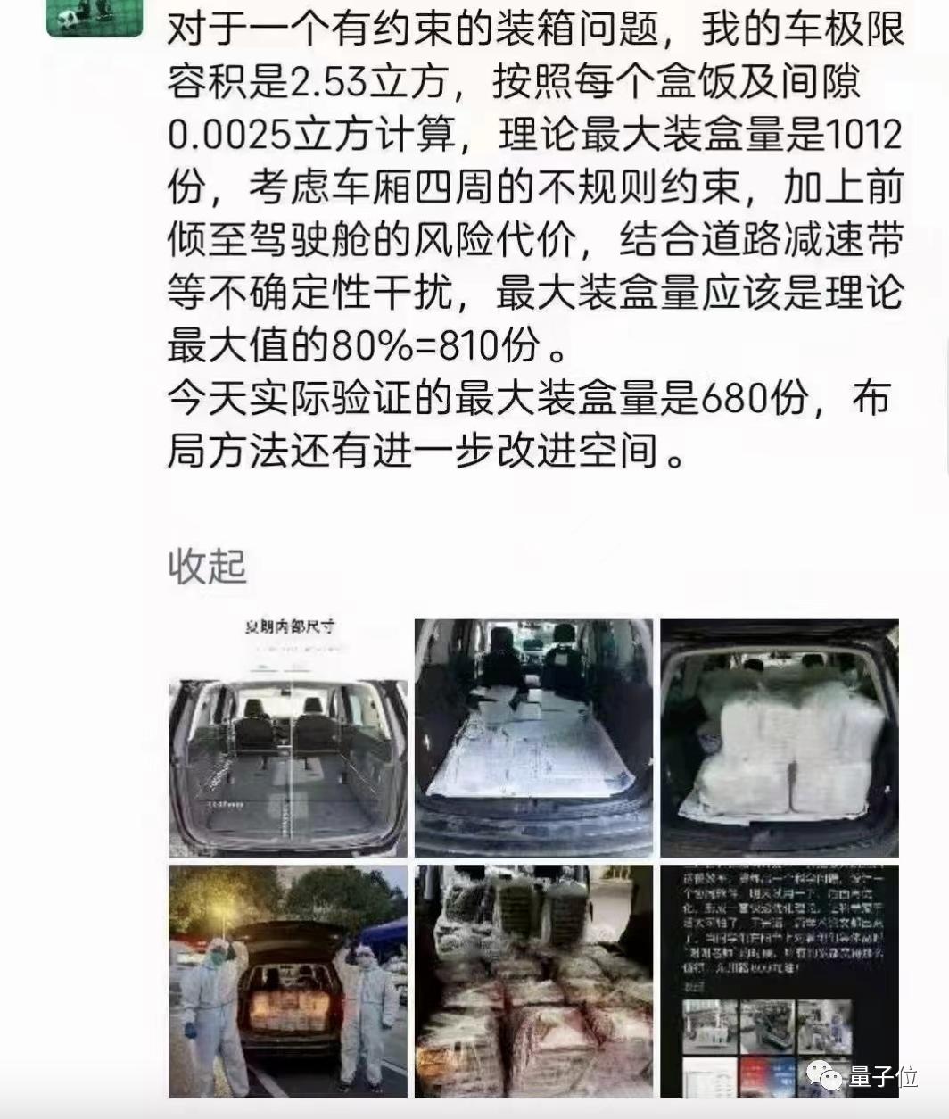经过严密测量,这位老师算出来了自己的车极限容积是2.53立方,每个餐盒及间隙的大小约为0.0025立方。