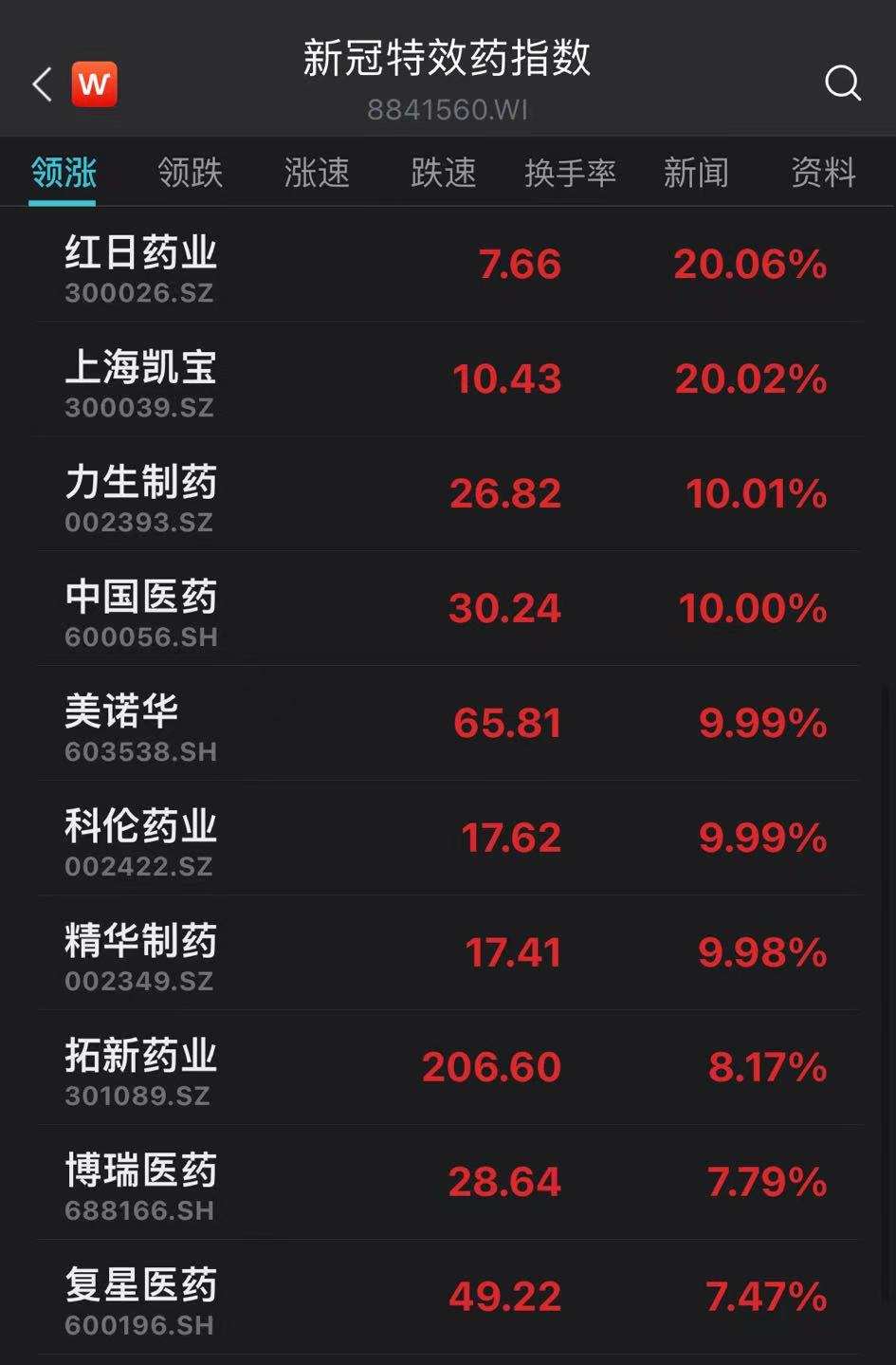 同样领涨的还有包括中药、新冠药物概念在内的医药股。红日药业、盘龙药业、精华制药、科伦药业等多股早盘涨停,佐力药业、千金药业、昆药集团、尖峰集团、富祥药业等跟涨。