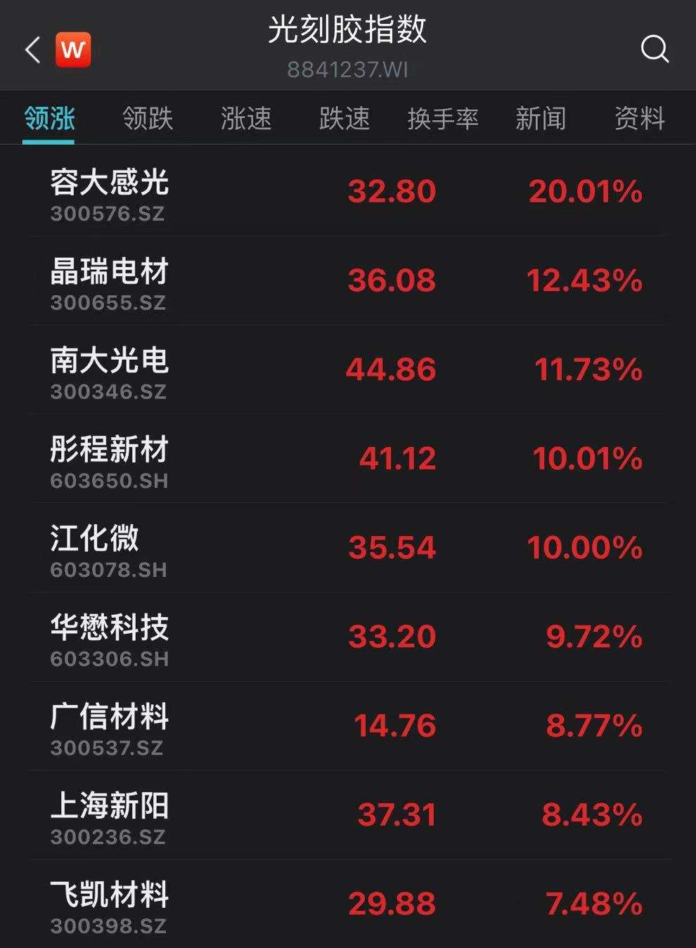 半导体、光刻胶板块掀涨停潮,容大感光、彤程新材、江化微等多股涨停。