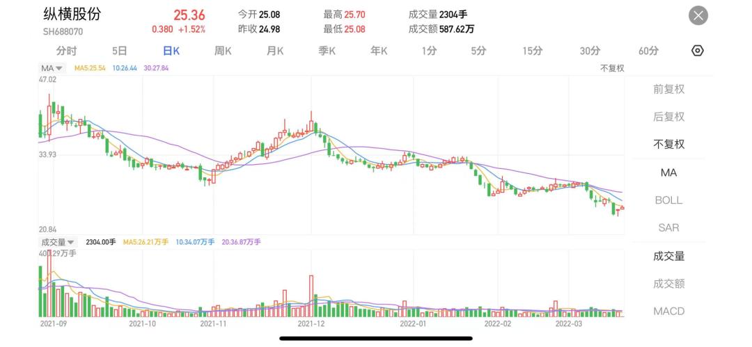 2021年2月,纵横股份登陆科创板,成为国内“无人机第一股”,实现了一定的高光,上市首日股价一度达到73.88元的高点。但是好景不长,如今来看,其股价已显出了颓势,不断走低,截止到3月17日收盘,股价为25.36元,最新总市值为22.21亿元。