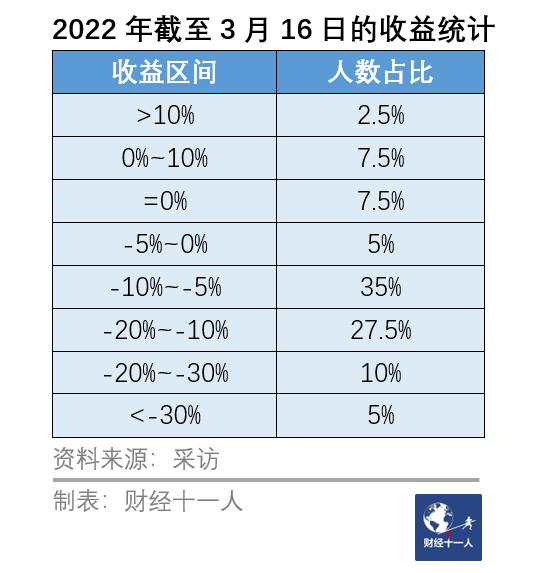 笔者希望看看这些人的炒股成绩是否优于普通股民,希望听听他们如何平衡风险和收益,更希望读者能从他们分享的心得中获得启发。2022年1月1日至3月16日,他们的收益统计如下: