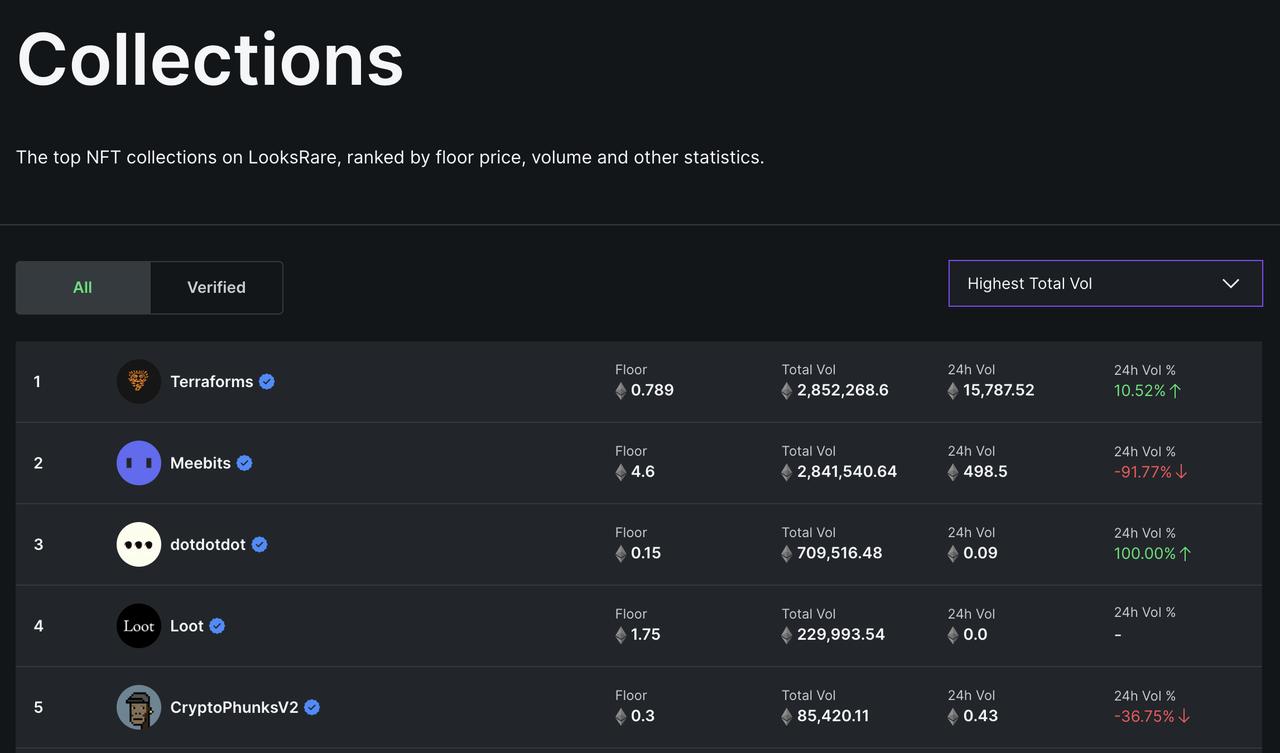 图|LooksRare 交易量前 5 NFT 官网 来自:LooksRare