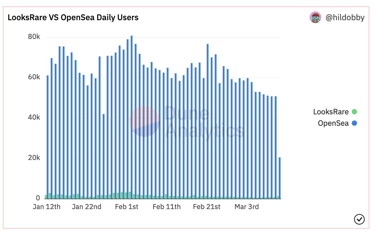 图 |LooksRare 和 OpenSea 日活用户数对比 来自:Dune