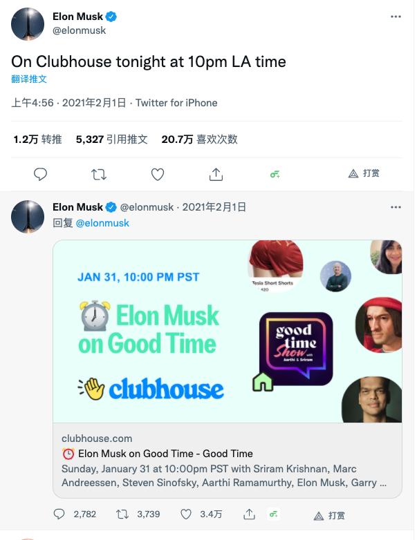 图 | Elon Musk 在 Twitter 上发布参与 Clubhouse 的信息 来自:Twitter
