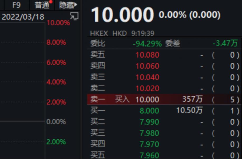 由于买方出价最高为8港元,低于卖方最低出价10.02港元,因此开盘后半小时,一直没有交易。