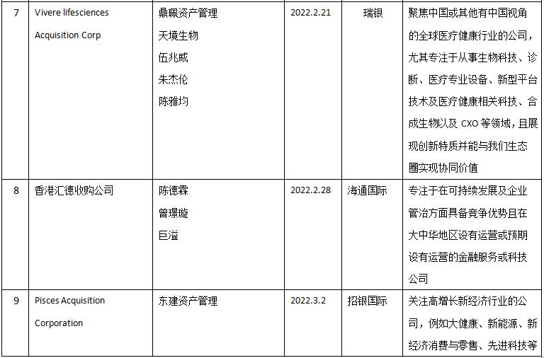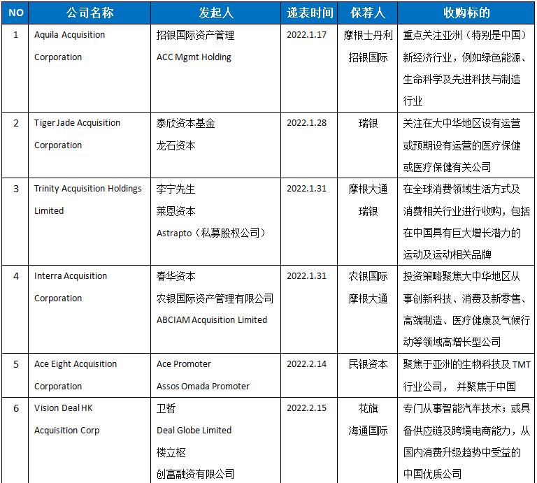 1月1日港交所正式发布特殊目的收购公司(SPAC)上市机制规则以来已有9家机构提交了申请,其背后发起人均投资机构巨头和金融圈资深投资人,既有前香港金管局总裁陈德霖、前渣打银行大中华区主席曾璟璇、嘉御资本创始人卫哲在内的知名投资人;也有招银国际、春华资本、农银国际、泰欣资本等机构巨头;还有包括天境生物、运动品牌李宁在内的知名企业和企业家。