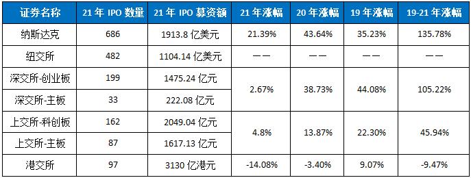 全球最活跃交易所2021年IPO及涨跌情况