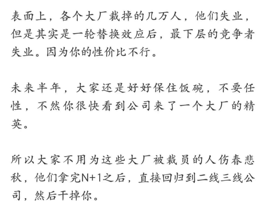 所以仔细看下来,能被大厂淘汰的,基本是基层员工和基本管理,他们的资质也许比一般员工高一些,
