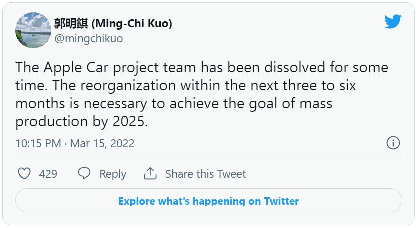 由于郭明錤常年分析和爆料苹果相关的内容、且准确度极高,因此在其曝出这一消息后,一度成为了业内及众多媒体竞相讨论和报道的重大新闻。由于苹果截至发稿前未对此爆料做出任何公开声明,苹果造车项目的近况已陷入疑云中。