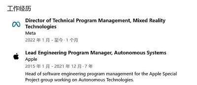 今年1月底,据彭博社报道。苹果造车团队的Joe Bass已完成离职,按照其更新的简历内容来看,他已担任Meta公司的VR技术项目管理总监一职,玩起了“元宇宙”。