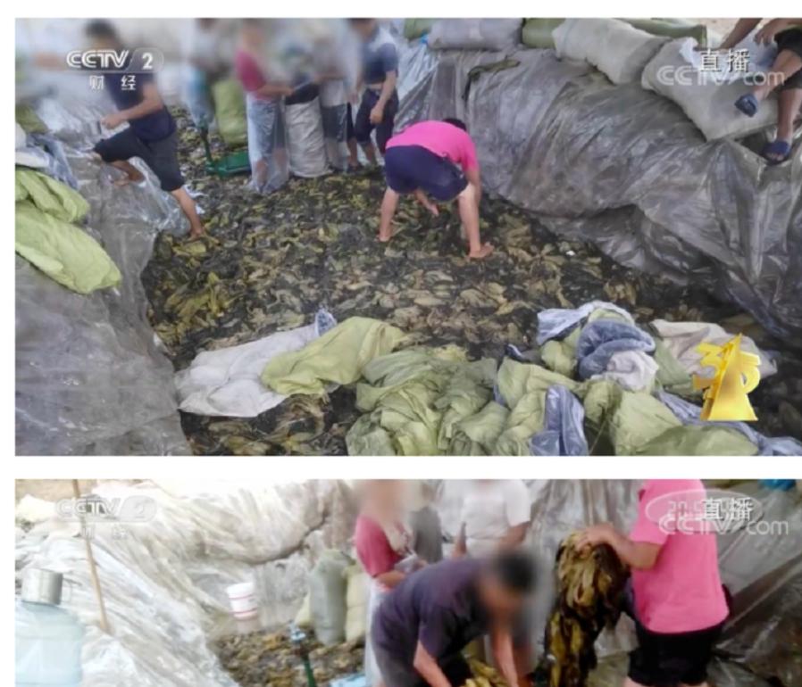 员工们在上面踩来踩去,有光着脚的,有穿着雨靴的,还有的直接抽完烟,把烟头直接扔到酸菜里。