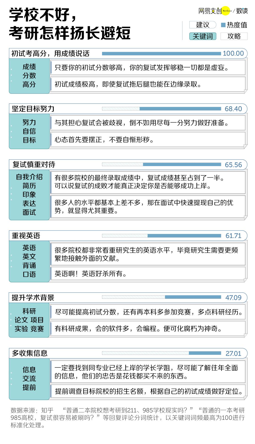 我们统计了知乎网友为普通高校学生考研给出的建议,学会收集信息、分析形式,保持坚定自信,努力在初试高分,以及提升自己的学术背景都缺一不可。