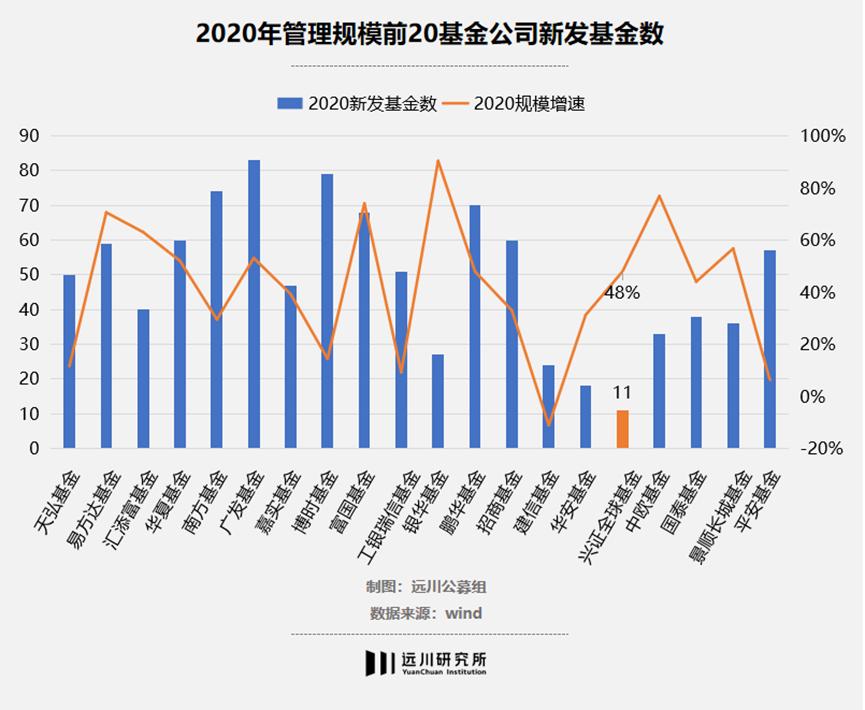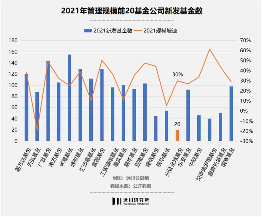 以兴证全球基金为例。2020年、2021年,兴全基金分别发行了11只、20只新基金,是同等规模基金公司里发行数量最少的公司,但在这两年,兴全的管理规模增速依然达到了48%、30%,并不落后于其它公司,甚至比一些一年发行上百只基金的公司规模增速更快。