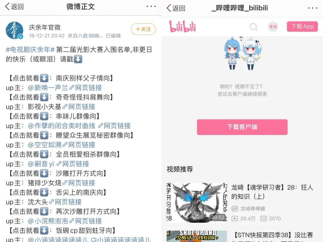 在《庆余年》热播时,腾讯视频曾发起过“光影剪刀手比赛”为剧造势,但剧集一播完,很多二次剪辑就被下架,《庆余年》的官方微博上公示的光影大赛的入围名单里,基本上所有B站up主的连接都显示“视频不见了”。