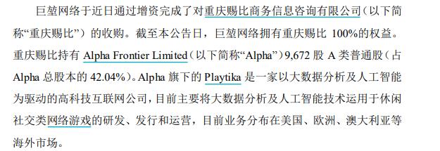 巨人网络相关公告显示,2016年巨人网络准备以44亿美元现金收购凯撒娱乐旗下的Playtika。不过,2016年的那次收购最终以失败告终。此后几年间,巨人网络也曾多次推动重大资产重组收购Playtika,但均未成功。