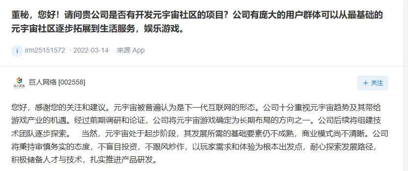 两天前,巨人网络在投资者互动平台表示:“元宇宙被普遍认为是下一代互联网的形态。公司十分重视元宇宙趋势及其带给游戏产业的机遇。经过前期调研和论证,公司将元宇宙游戏确定为长期布局的方向之一。公司后续将组建技术团队逐步探索等。”