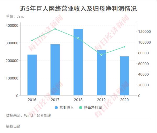 WIND数据显示,2016年~2020年,巨人网络营业收入分别为23.24亿元、29.07亿元、37.8亿元、25.7亿元、22.17亿元,同比增长17.6%、25.10%、30.03%、-31.96%、-13.77%;归属母公司所有者的净利润分别为10.69亿元、12.90亿元、10.78亿元、8.20亿元、10.29亿元,同比增长338.15%、20.71%、-16.44%、-23.94%、25.48%。