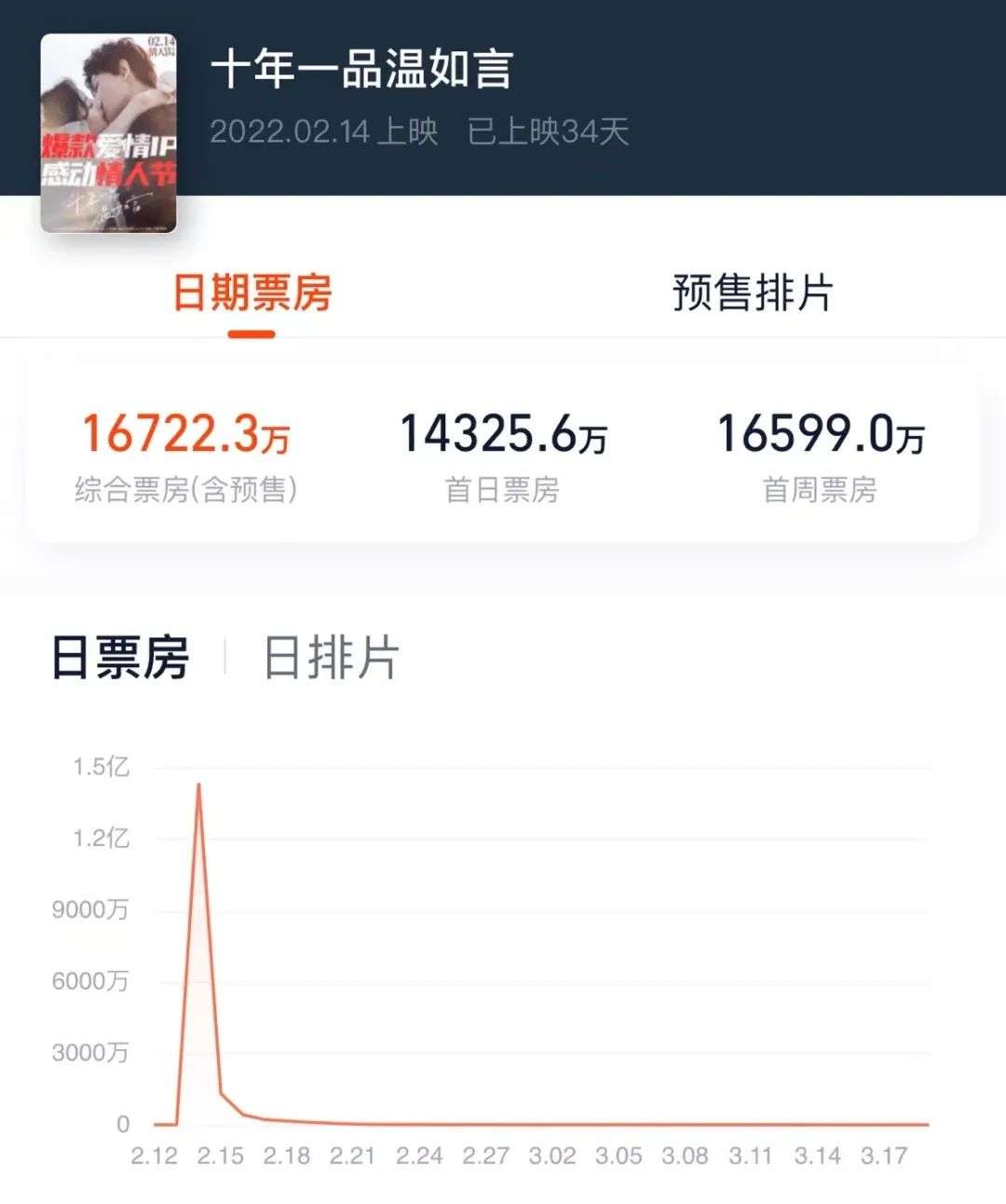 这一点,在票房上有最直观的呈现:今年情人节档期的《十年一品温如言》在上映第二天单日票房就滑至一千多万,另外两部新片票房还不过千万,相比情人节当天是断崖式的下坠。