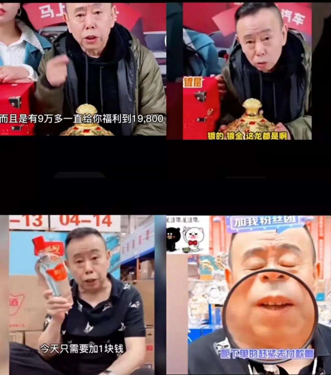 2021年潘长江在直播间推出原价9万9的“纯金酒瓶”,“今天在潘叔直播间,如果你有那实力,如果有哪个老板说我太喜欢这酒,我太喜欢潘叔了,潘叔还能给我签个名,在潘叔直播间只需要19800。”