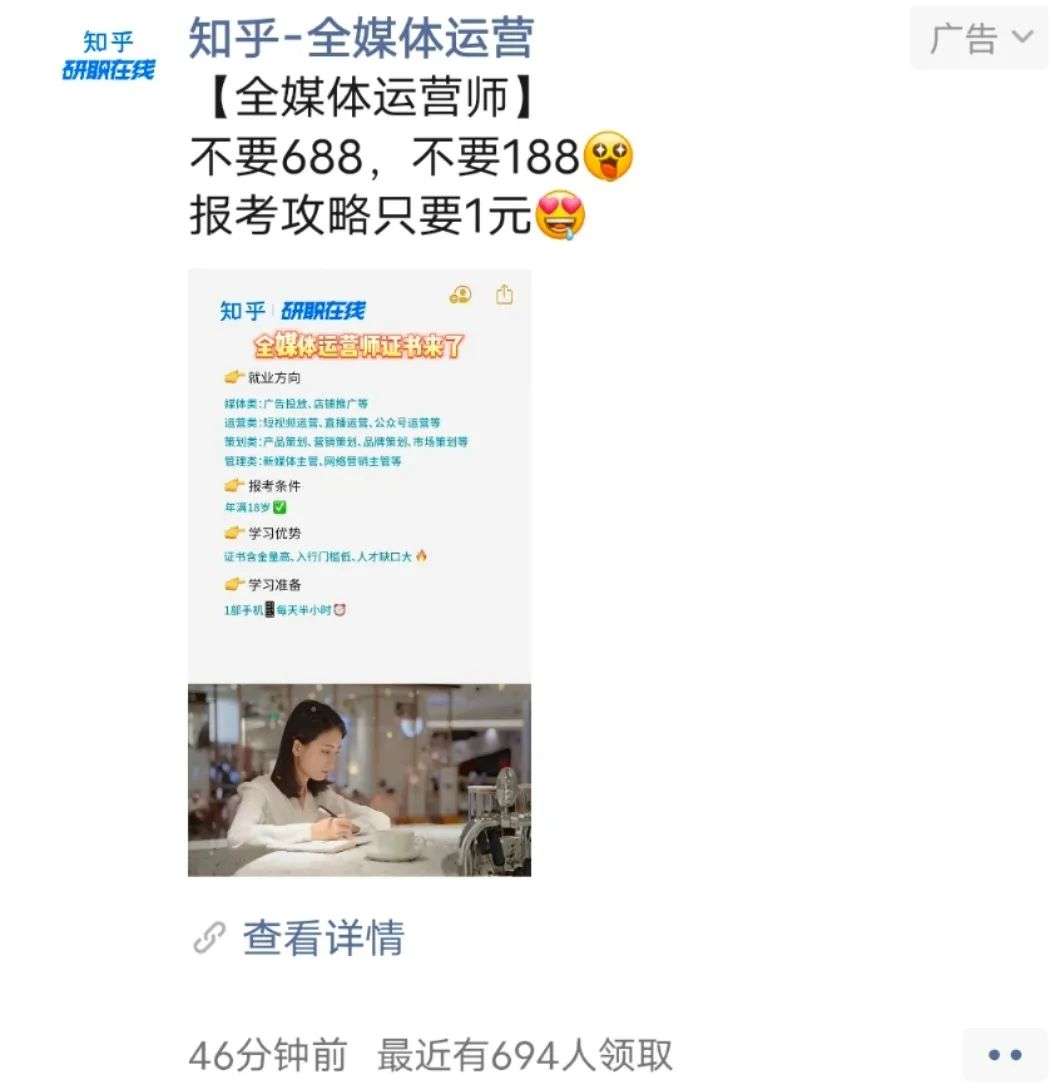 另外,知乎教育广告投放上也下了血本,《新言财经》发现从去年开始,知乎在抖音、微信等多个大平台进行广告投放。