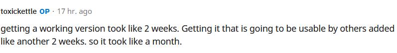 项目作者称,做出可以运行的模型雏形用了两周,把模型修改到其他用户也能用,又花了两周。总共在项目上投入的时间大概1个月。