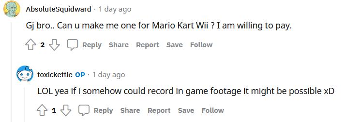 网友:「大兄弟干得漂亮,能做个马里奥赛车版本的么?我愿意打钱。」