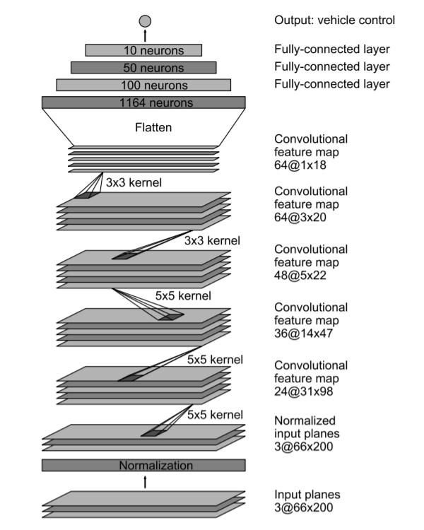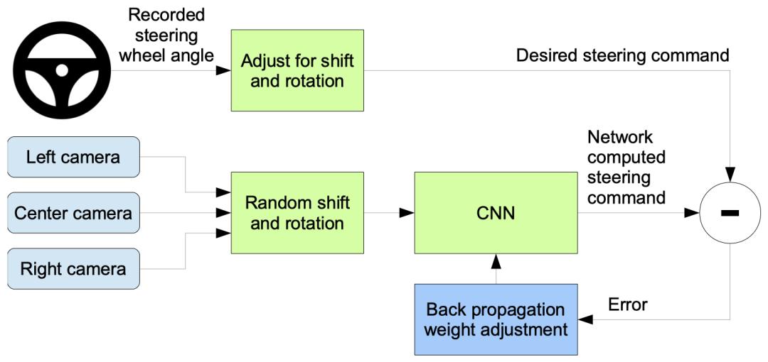 在训练过程中,图像最先会被输入到一个CNN网络之中,然后计算出一个转向的指令。