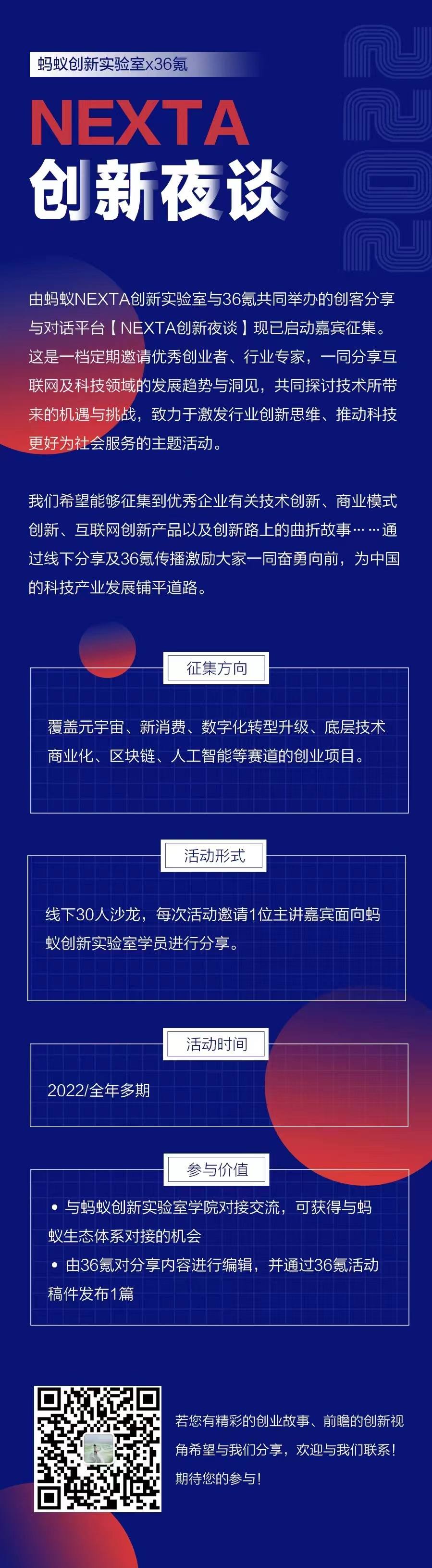 蚂蚁NEXTA创新实验室成立于2021年8月,其目的是为全新的创新机遇提供孵化基地。而36氪作为创投领域的头部媒体,始终关注创新经济的趋势与发展。本次共同举办「NEXTA创新夜谈」,携手发力,是因为我们始终坚定地相信创新的力量,也坚定地认为这些创新者、创新故事、创新模式等需要被连接,被分享和被看见,从而掀起一场创新的嬗变。以下是此次征集说明,欢迎参与我们的「NEXTA创新夜谈」: