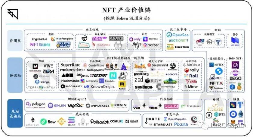 2021年宜信区块链研究院在《一文读懂元宇宙、NFT的发展现状》中,也曾对NFT产业价值链做过类似分层。整体而言,我们觉得还是能够体现当前NFT产业价值链的发展现状的。