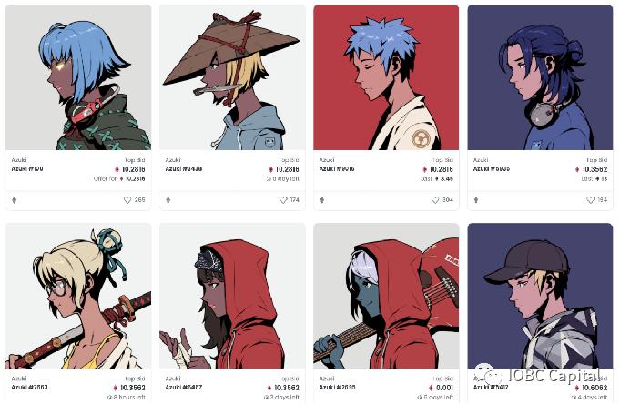 2022年1月发行的日系动漫风主题NFT,画风精致,首发10000个。每个NFT在发型、眼睛、嘴巴、脖子、服装配饰、背景类型等维度有差异。