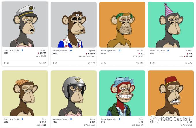 简称BAYC,无聊猿猴游艇俱乐部,于2021年4月推出,共10000个猿猴图片NFTs。这些猴子是通过编程方式随机组成的一万只,每只猿猴的服装、配饰、背景、神态表情都是独一无二的,无聊猿猴游艇俱乐部布局在以太坊区块链上。