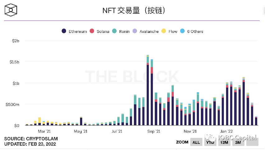 目前,绝大多数NFT交易是发生在以太坊链上,Solana、Ronin、Avalanche、Flow等区块链的NFT交易量占比尚小。
