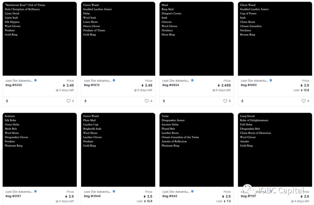 Loot是一个有8行英文单词的黑底白字NFT。实际上每一枚Loot都代表一组具有随机稀缺性的冒险装备,装备中包含的8个物件分别对应冒险者的武器、头甲、胸甲、腰带、护手、腿甲、项链、戒指。