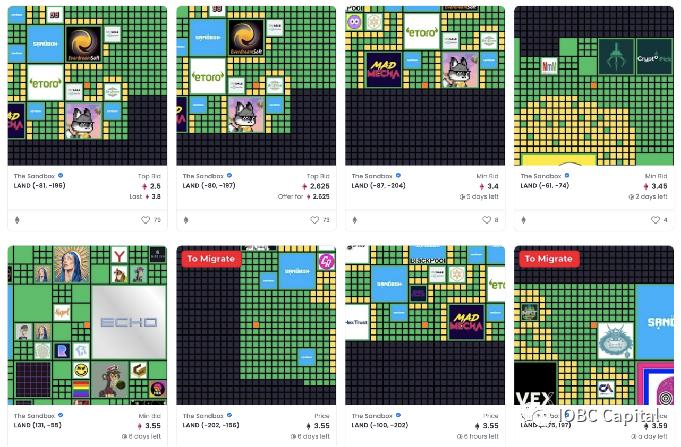 Sandbox land 限量166464块地,有3*3的地块,也有6*6、12*12、24*24的地块,地板价3.78 ETH,比Decentraland的地板价略低。