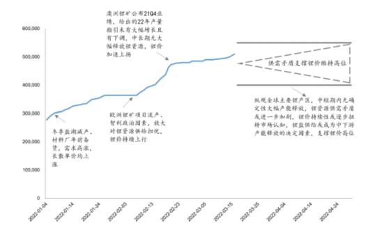 随着锂盐企业加大供应,产能逐渐释放,锂盐价格有望趋稳,甚至出现回落。锂价预计当前维持高位,22年三季度以后供需边际宽松。