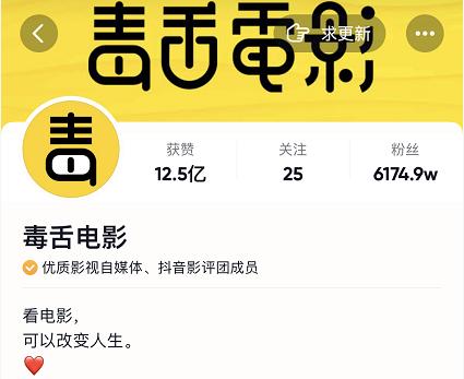 抖音上的Top1影视二创类账号毒舌电影,粉丝数高达6174.9W。