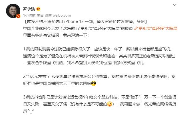 3月21日下午,罗永浩在1个小时内连发9条微博,对此前传出的“罗永浩最早将在下个月彻底还完债务”的消息进行辟谣。为此,其还采取了转发抽奖送一部iPhone 13的方式,邀请网友们帮忙澄清。