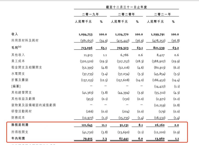 从餐饮成本三座大山(原材料、员工、租金)来看,捞王这三项样样皆重,2021年度原材料成本占比36.8%、员工29.9.%、租金14.4%。2019年度这三项成本合计占比76.7%,2020年占比升至79.2%,2021年度再升至81.1%。