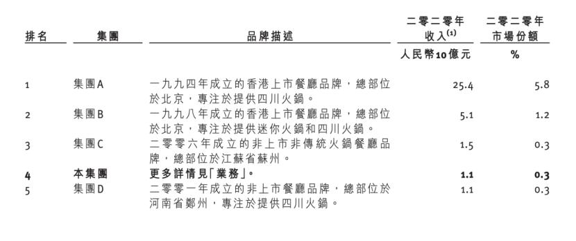 尽管新开店铺几近亏损,捞王依旧是国内火锅品牌top4,粤式火锅品牌top1。在分散的火锅市场中,市场份额给了捞王上市及不断扩店的底气。根据弗若斯特沙利文报告,2020年,捞王以11亿元收入占据0.3%的市场份额。其余四名为海底捞、呷哺呷哺、七欣天、巴奴,其中七欣天于今年年初向港交所递交招股书。