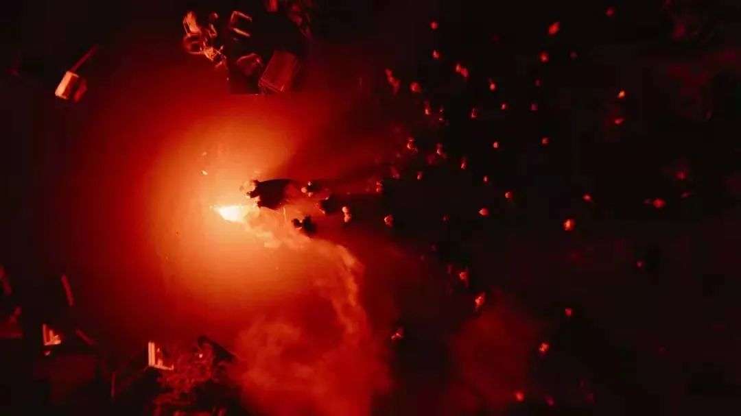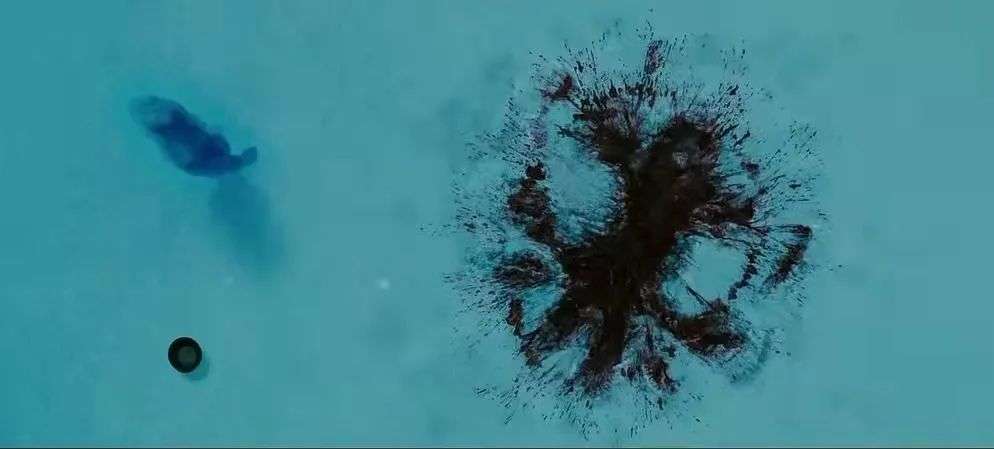 于是他在空中一跃而起,抓住那根漏电的电缆,拔出胸前的蝙蝠刀,劈断、坠入水中、浮起。他注视着洪水中的众人,此刻宗教般的镜头语言开始为其赋予神性,他举起猩红色的火炬,观众们的视角俯视着,他如丹柯般带领众人在水中蹒跚前行。