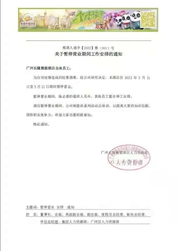 一封熊猫酒店员工转发旅界的《关于暂停营业期间工作安排的通知》显示,广州长隆熊猫酒店暂停营业期间,公司将提供系列活动及培训,以提高员工的知识技能,保持职业竞争力。