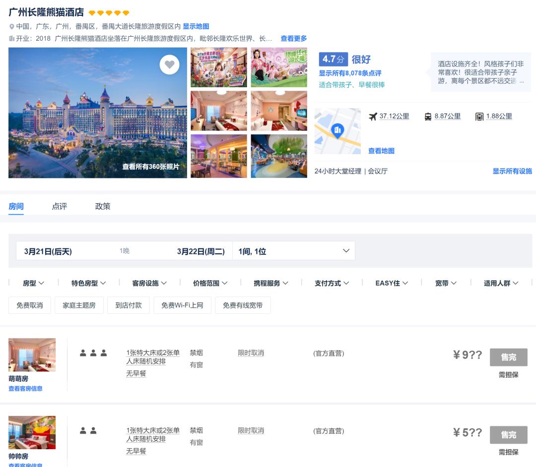 旅界查询携程发现,3月21日至5月21日期间,广州长隆熊猫酒店客房均显示“售完”。