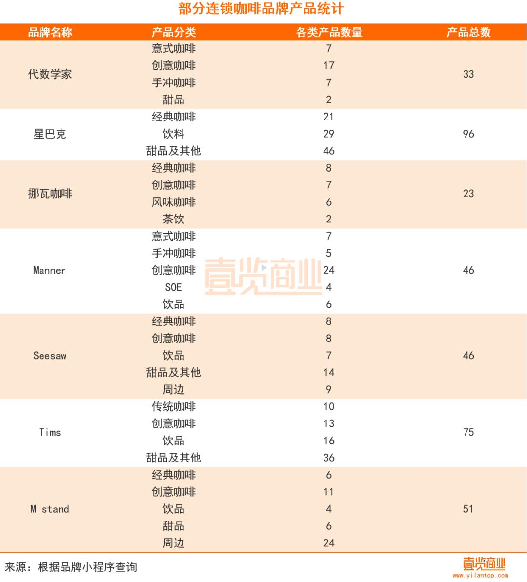 为了分析代数学家的产品布局,壹览商业统计了代数学家、星巴克、挪瓦咖啡、M stand、Manner、Seesaw、Tims的产品分类。在产品布局上,代数学家还算克制,目前只集中在咖啡上,包括意式咖啡、创意咖啡、手冲咖啡,甜品也只上架了2款,总产品数共33款。至于周边产品,也只能在淘宝旗舰店和线下门店购买,最高价格的周边是一款240ml的保温杯,价值218元。