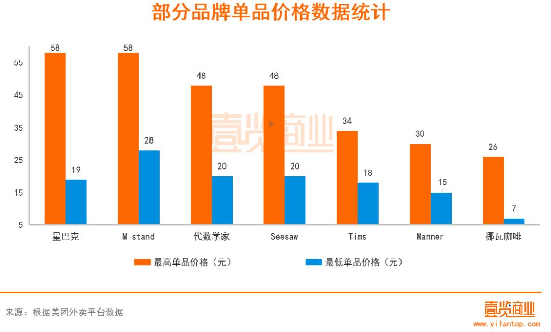 除了看月销,在品牌价格带上也发现了有意思的现象。代数学家的价格在20-48元,和Seesaw相同,相对来说价格带较宽,在中高价范围内。星巴克的价格带在19-58元,探到了咖啡最高价。而M stand价格在28-58之间,比星巴克价格区间要小,同样达到了58元的最高价。