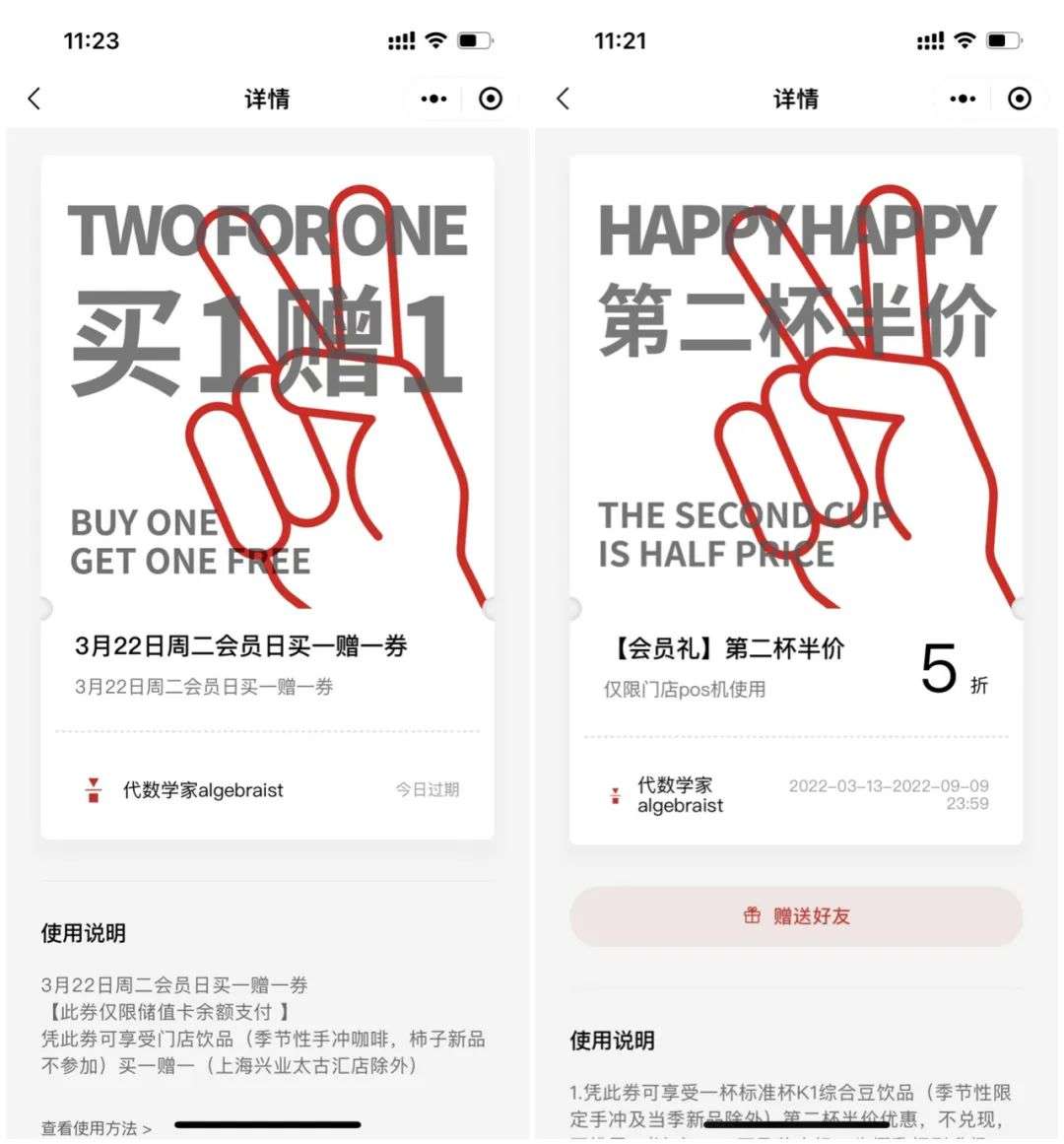 值得一提的是,代数学家为了吸引用户到店,安排了星期二会员如到店消费买一赠一、以及第二杯半价的活动。