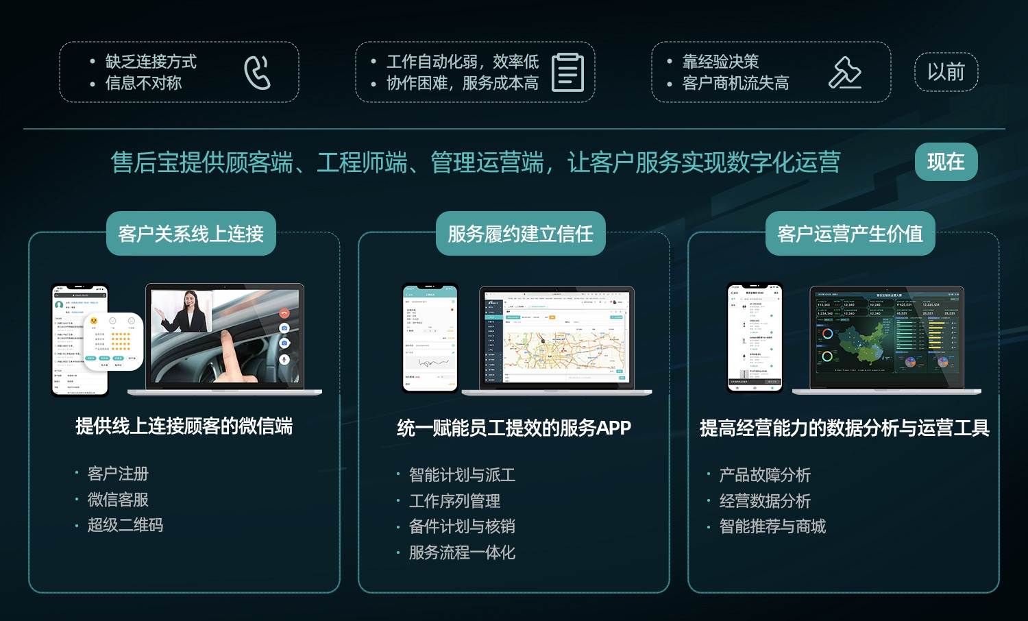 售后宝针对不同人群,提供不同解决方案:在微信端,连接顾客,解决产品销售出去但缺少顾客信息的问题;在工程师APP上,解决服务质量无法保障和工作效率不高的问题;同时通过数据看板和运营工具,解决企业缺乏数据支撑和运营方法的问题。