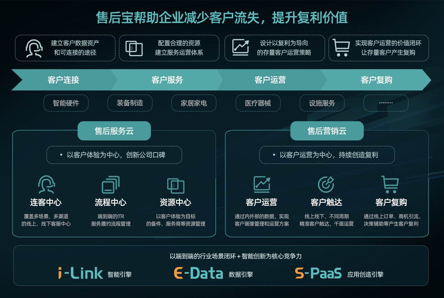 2017年7月,售后宝正式上线,为企业提供包括售后服务云和售后营销云的解决方案,帮助企业服务好客户减少客户流失,经营好存量客户关系从而产生更多复购机会。
